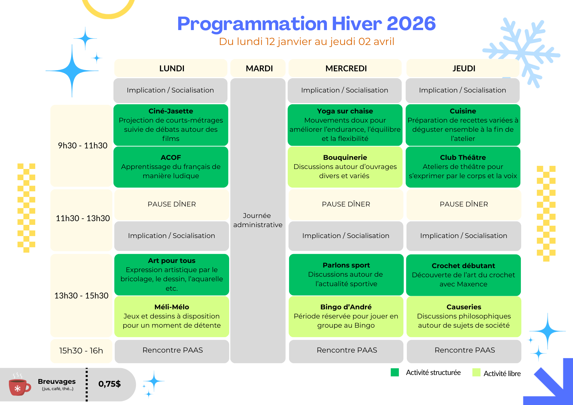 Des activités diversifiées sont offertes du lundi au mercredi, de 8 h 30 à 16 h 30. Elles contribuent toutes à briser l’isolement, à augmenter l’estime de soi et favorisent l’autonomie et l’engagement.